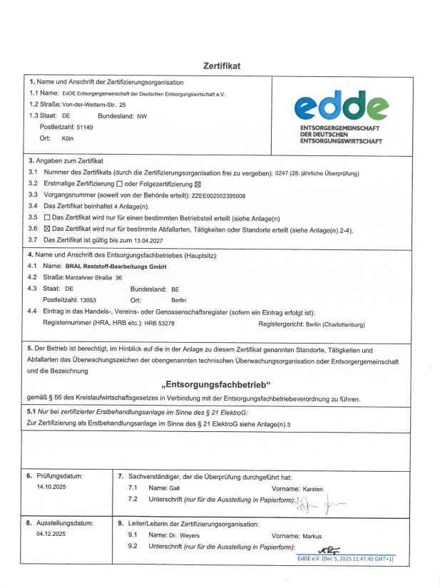 Die BRAL GmbH hat im Rahmen des ALBA-Verbundes die Zertifizierungsphase gemäß den ISO-Empfehlungen erfolgreich durchgeführt. Das erste Audit erfolgte am 06.11.1996 mit nachfolgender Übergabe der Zertifizierungsurkunde, Registrier-Nr. 011009701008/14. Die erforderlichen Nachaudits werden regelmässig erfolgreich absolviert.Am 29.10.1997 erfolgte das Audit zur Prüfung als Entsorgungsfachbetrieb. Das Zertifikat Nr. 0247 wurde der BRAL GmbH übergeben. Die erforderlichen Nachaudits wurden erfolgreich absolviert.